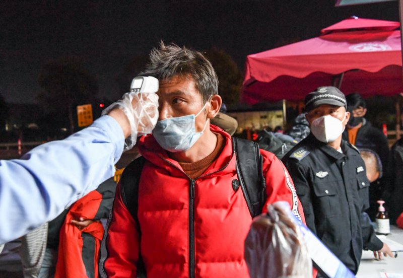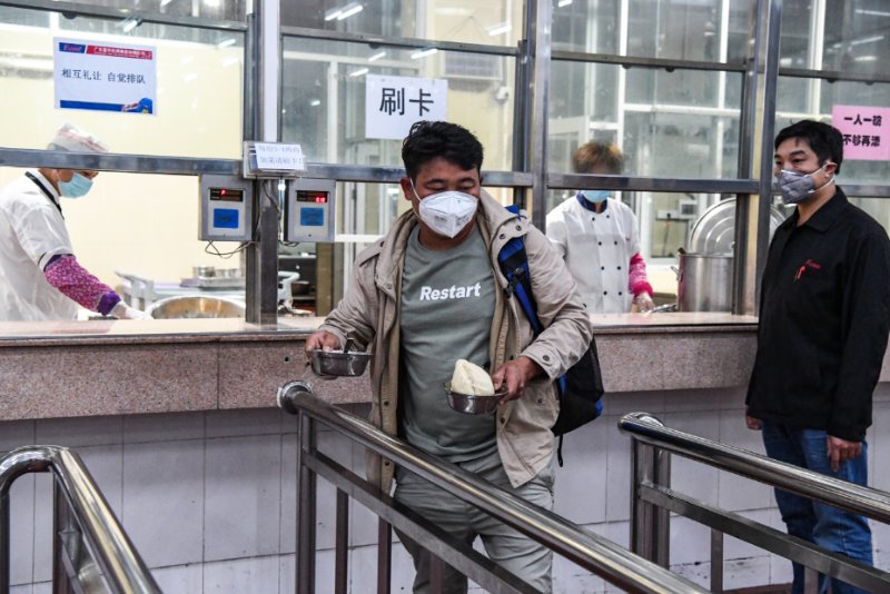 员工们下车集结之后,防疫工作人员依次为他们测量体温并进行消毒防护处理,指引员工们有序进食堂就餐,然后回宿舍休息,为第二天安全复工做好准备。